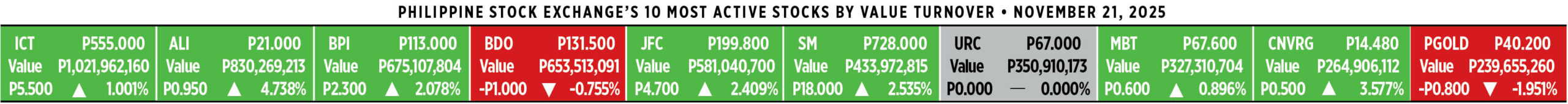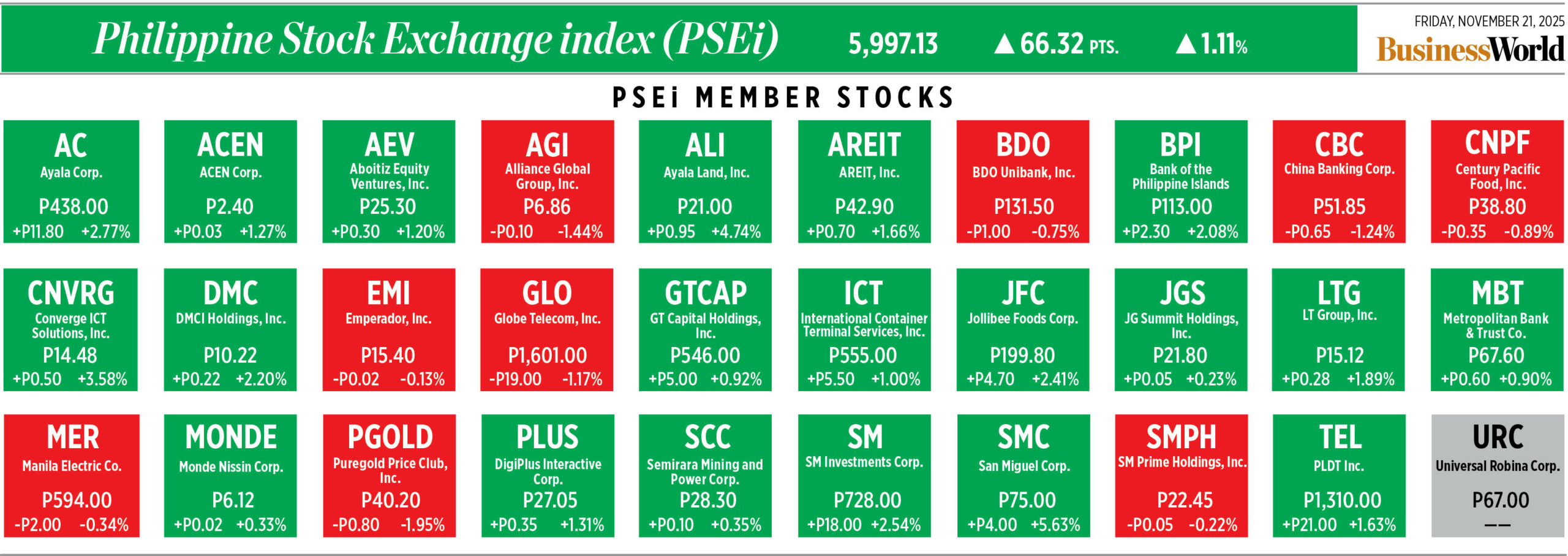 Home Corporate How PSEi member stocks performed — November 21, 2025 Corporate How PSEi member stocks performed — November 21, 2025 November 24, 2025 | 12:00 am Here’s a quick glance at how PSEi stocks fared on Friday, November 21, 2025.