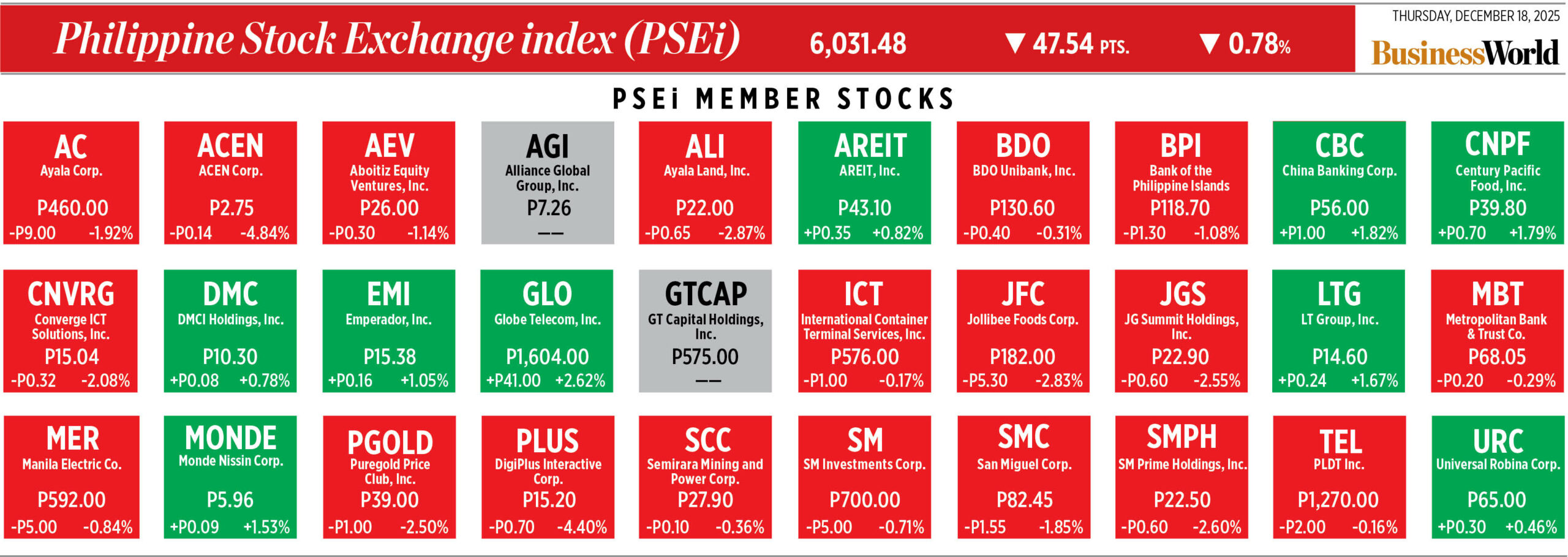 Home Corporate How PSEi member stocks performed — December 18, 2025 Corporate How PSEi member stocks performed — December 18, 2025 December 19, 2025 | 12:00 am Here’s a quick glance at how PSEi stocks fared on Thursday, December 18, 2025.