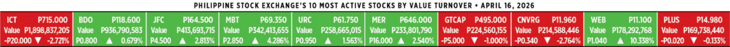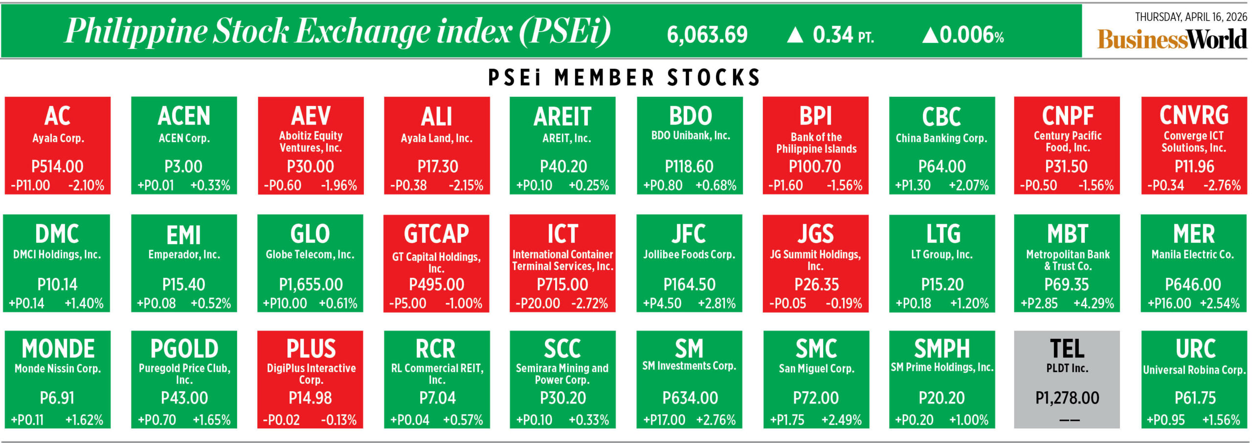 Home Corporate How PSEi member stocks performed — April 16, 2026 Corporate How PSEi member stocks performed — April 16, 2026 April 17, 2026 | 12:00 am Here’s a quick glance at how PSEi stocks fared on Thursday, April 16, 2026.