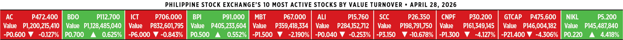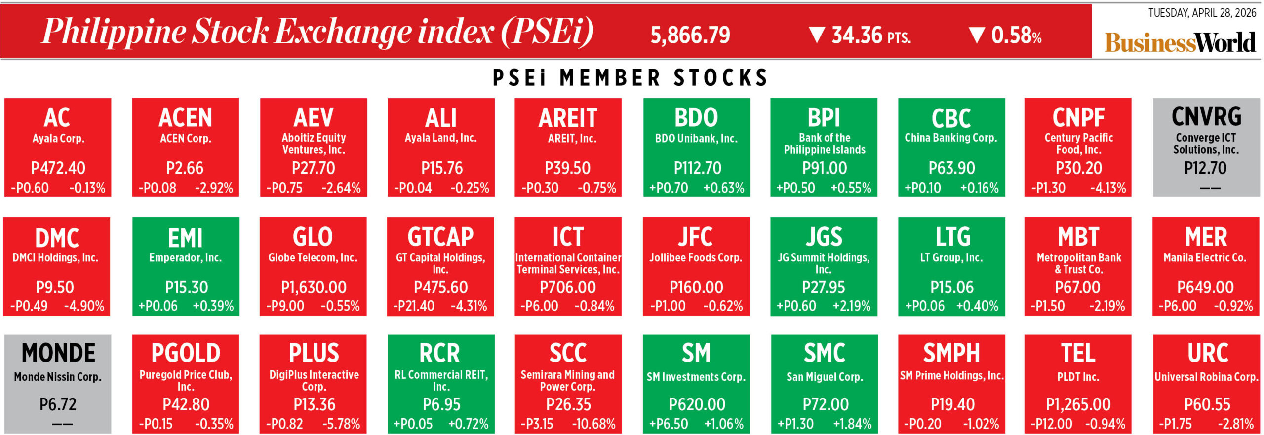 Home Corporate How PSEi member stocks performed — April 28, 2026 Corporate How PSEi member stocks performed — April 28, 2026 April 29, 2026 | 12:00 am Here’s a quick glance at how PSEi stocks fared on Tuesday, April 28, 2026.