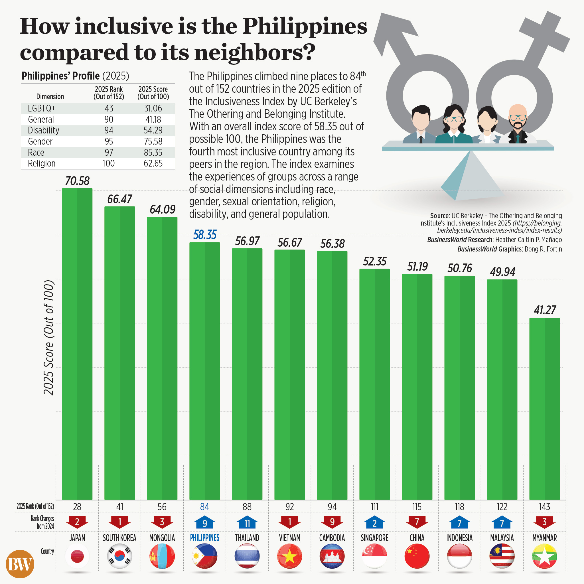 The Philippines climbed nine places to 84th out of 152 countries in the 2025 edition of the Inclusiveness Index by UC Berkeley’s The Othering and Belonging Institute. With an overall index score of 58.35 out of possible 100, the Philippines was the fourth most inclusive country among its peers in the region. The index examines the experiences of groups across a range of social dimensions including race, gender, sexual orientation, religion, disability, and general population.