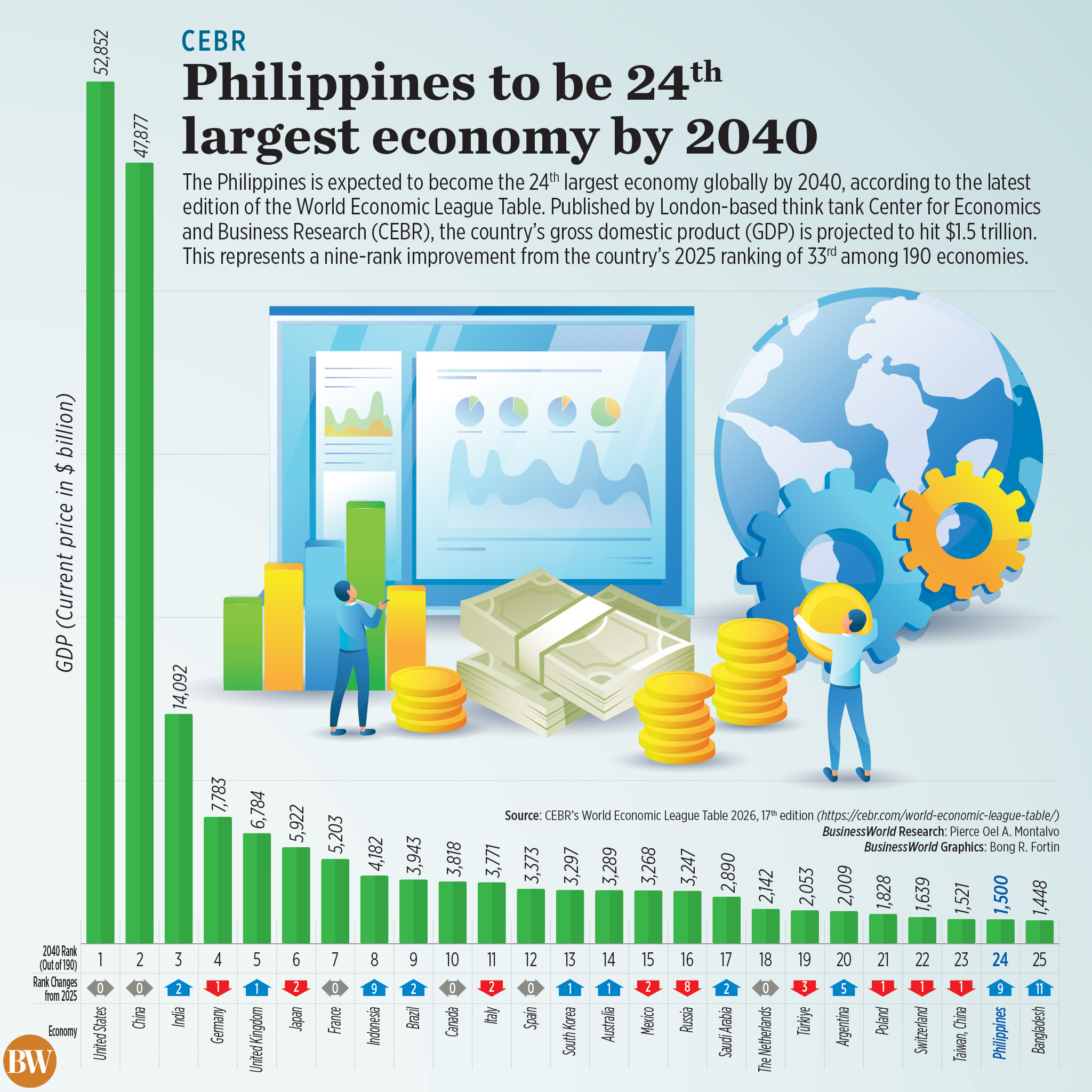 The Philippines is expected to become the 24th largest economy globally by 2040, according to the latest edition of the World Economic League Table. Published by London-based think tank Center for Economics and Business Research (CEBR), the country’s gross domestic product (GDP) is projected to hit $1.5 trillion. This represents a nine-rank improvement from the country’s 2025 ranking of 33rd among 190 economies.