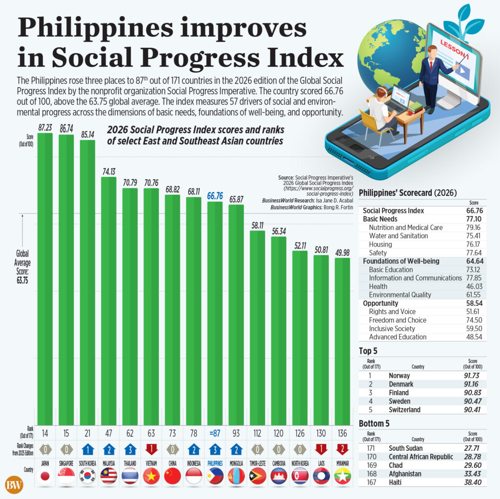 The Philippines rose three places to 87th out of 171 countries in the 2026 edition of the Global Social Progress Index by the nonprofit organization Social Progress Imperative. The country scored 66.76 out of 100, above the 63.75 global average. The index measures 57 drivers of social and environmental progress across the dimensions of basic needs, foundations of well-being, and opportunity.