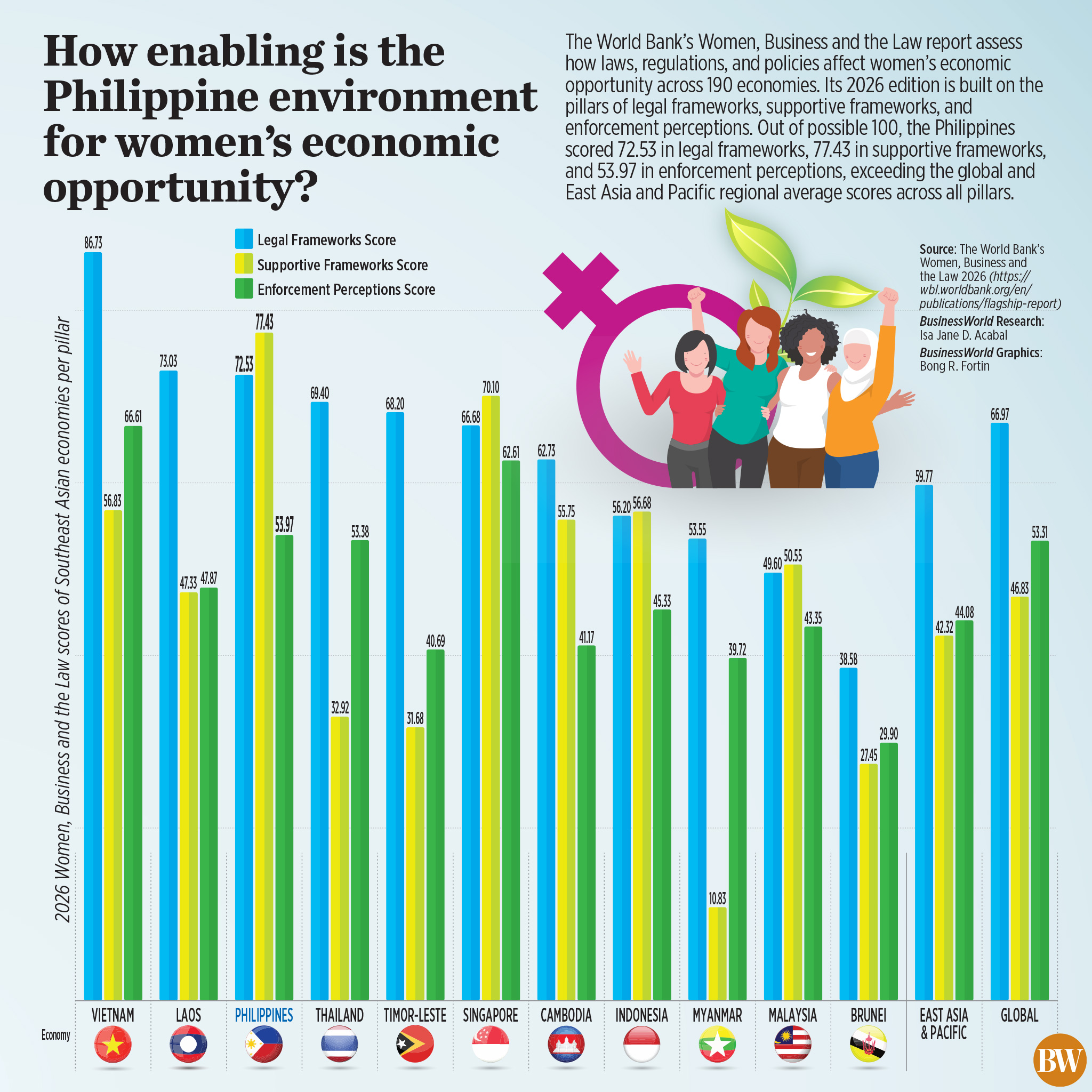 THE PHILIPPINES improved in two of the three pillars in the World Bank’s Women, Business, and the Law (WBL) 2026 report, with scores surpassing the global and East Asia and Pacific averages. Read the full story.
