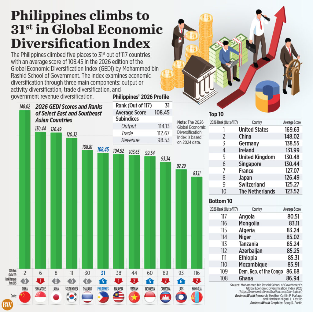The Philippines climbed five places to 31st out of 117 countries with an average score of 108.45 in the 2026 edition of the Global Economic Diversification Index (GEDI) by Mohammed bin Rashid School of Government. The index examines economic diversification through three main components: output or activity diversification, trade diversification, and government revenue diversification.