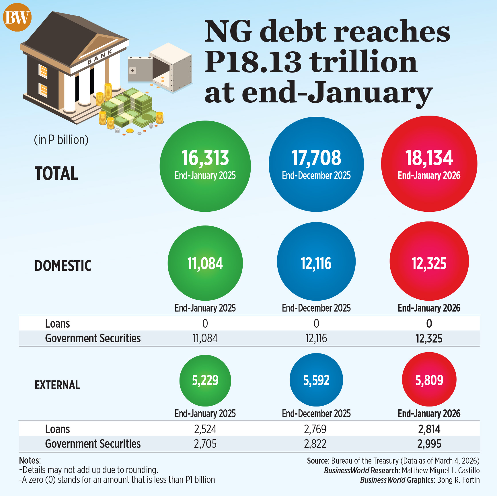 THE PHILIPPINES’ outstanding National Government (NG) debt rose to P18.13 trillion at the end of January, as the state accelerated borrowing at the start of the year to lock in funding ahead of global market volatility. Read the full story.