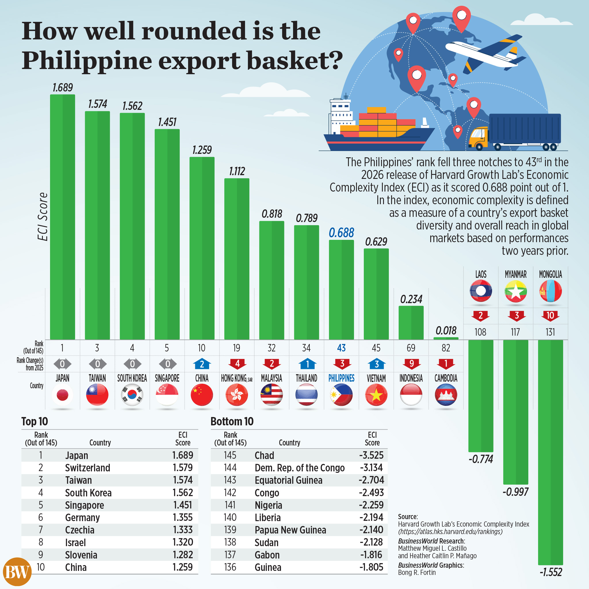 The Philippines’ rank fell three notches to 43rd in the 2026 release of Harvard Growth Lab’s Economic Complexity Index (ECI) as it scored 0.688 point out of 1. In the index, economic complexity is defined as a measure of a country’s export basket diversity and overall reach in global markets based on performances two years prior.