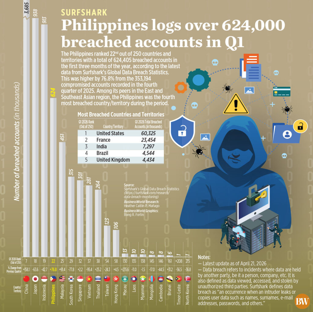 The Philippines ranked 22nd out of 250 countries and territories with a total of 624,405 breached accounts in the first three months of the year, according to the latest data from Surfshark’s Global Data Breach Statistics. This was higher by 76.8% from the 353,194 compromised accounts recorded in the fourth quarter of 2025. Among its peers in the East and Southeast Asian region, the Philippines was the fourth most breached country/territory during the period.