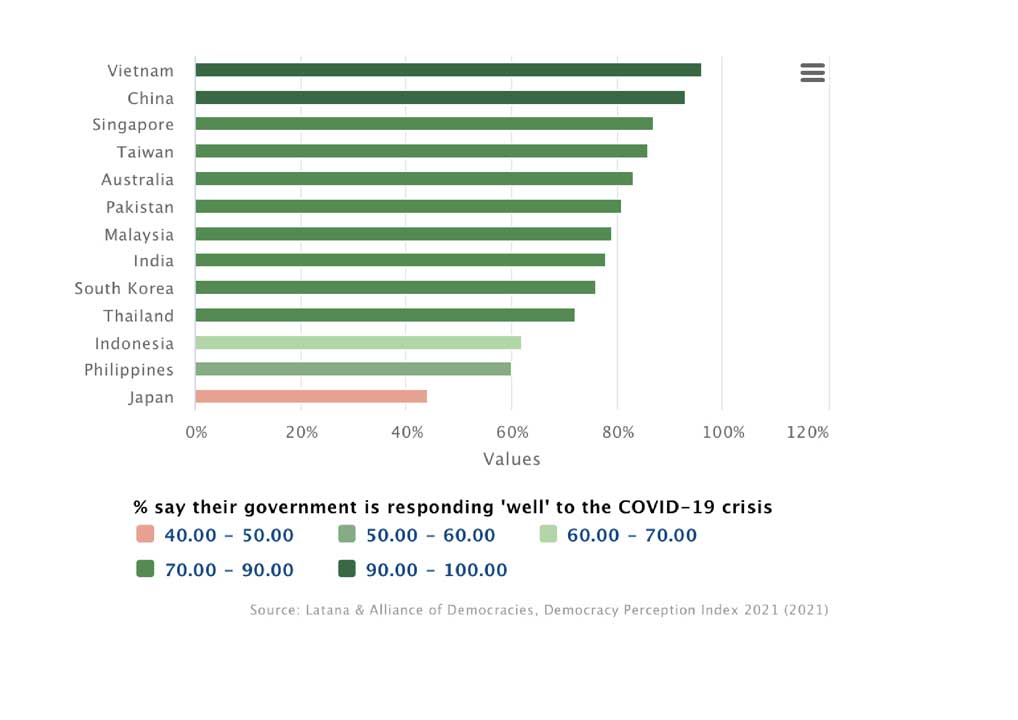 One interesting finding of International IDEA is that Vietnam’s authoritarian regime did not prevent it from getting popular support and people’s trust in, for instance, pandemic management. It delivered, and delivered well. China, Singapore, and Taiwan also received good feedback despite their democratic performance. Singapore has a hybrid regime while Taiwan, like the Philippines, is a mid-range performing democracy.