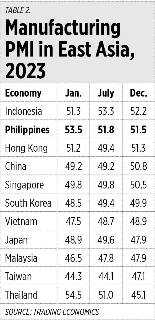 The Philippines’ PMI had been above 50 in 2023, the second highest after Indonesia in East Asia. Surprisingly, Vietnam, Malaysia, and Thailand’s PMIs were below 50 last year along with rich Asian countries like South Korea, Taiwan, and Japan (see Table 2).