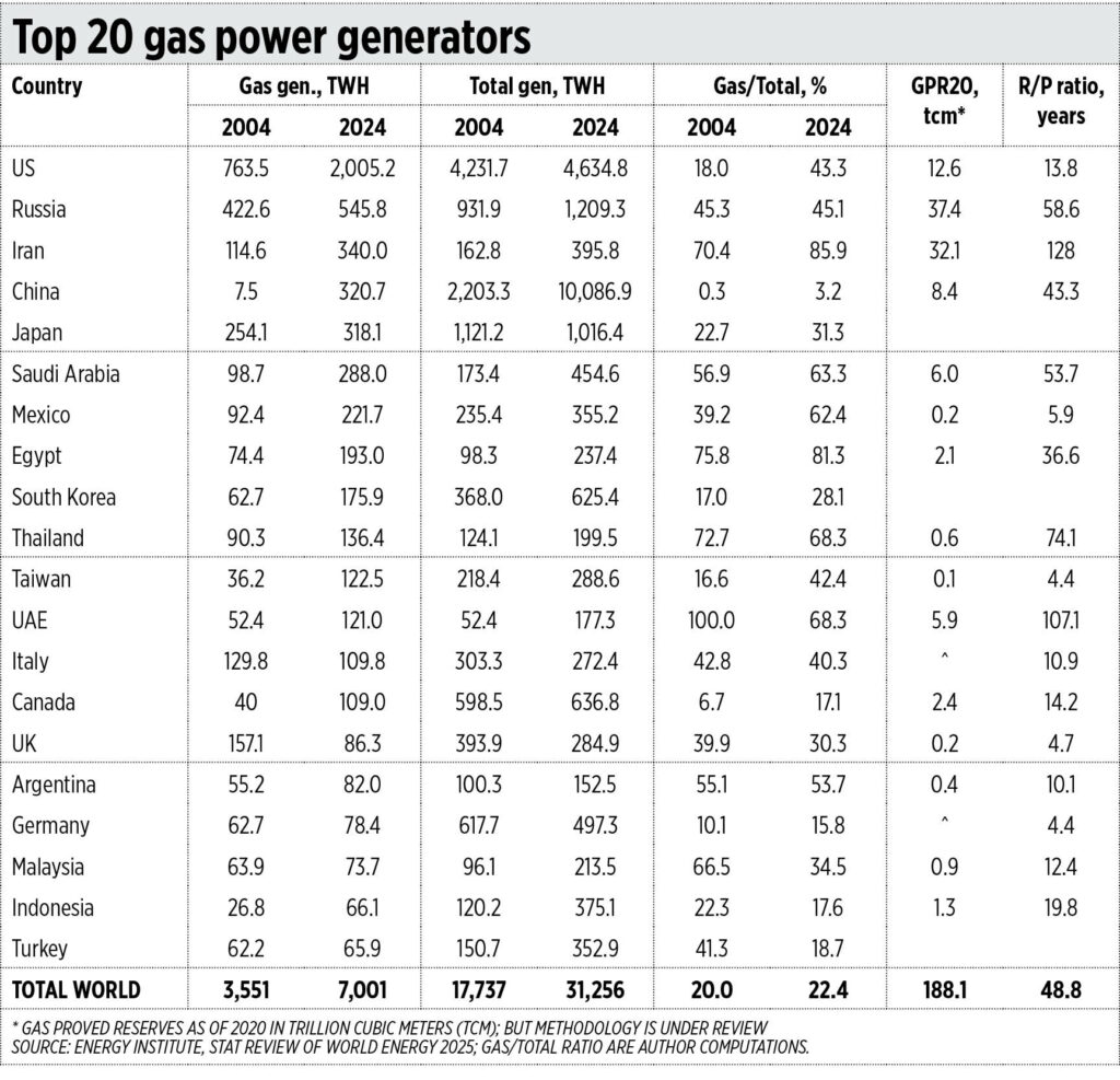 The most gas-dependent countries in the world when it comes to power generation would be Qatar and Singapore with 95% to 99% gas contribution to total. Gas used to power 100% of the United Arab Emirates’ energy needs, but since they built many nuclear power plants, the share of nuclear power in 2024 was 23% of the total.