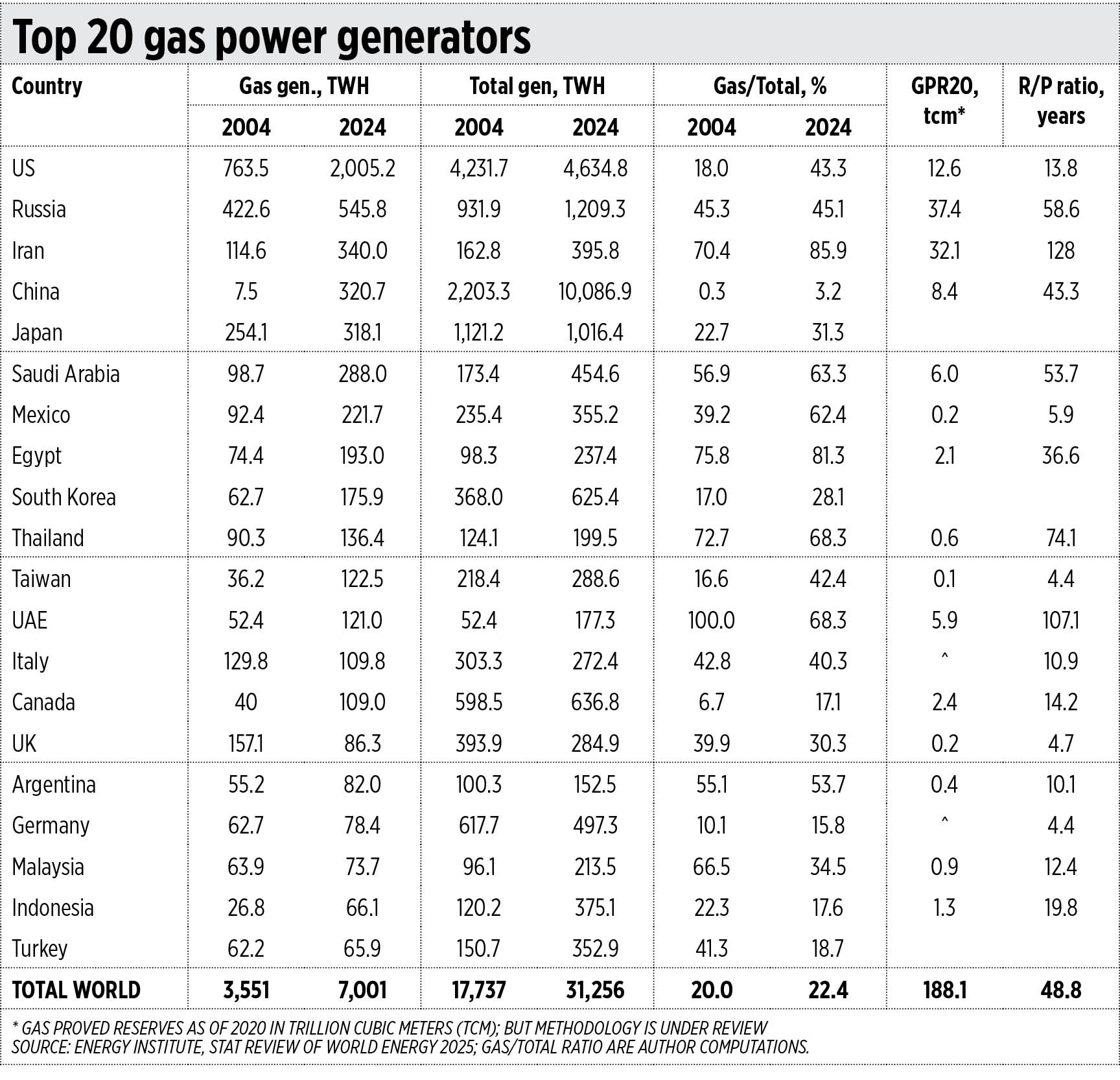 Japan is fifth in the world when it comes to gas power generation with 318 TWh, after the US, Russia, Iran, and China. But when it comes to gas Reserves/Production (R/P) ratio, among the largest are Iran with 128 years of R/P, Saudi Arabia with 54 years, and Russia with 59 years (see the table).