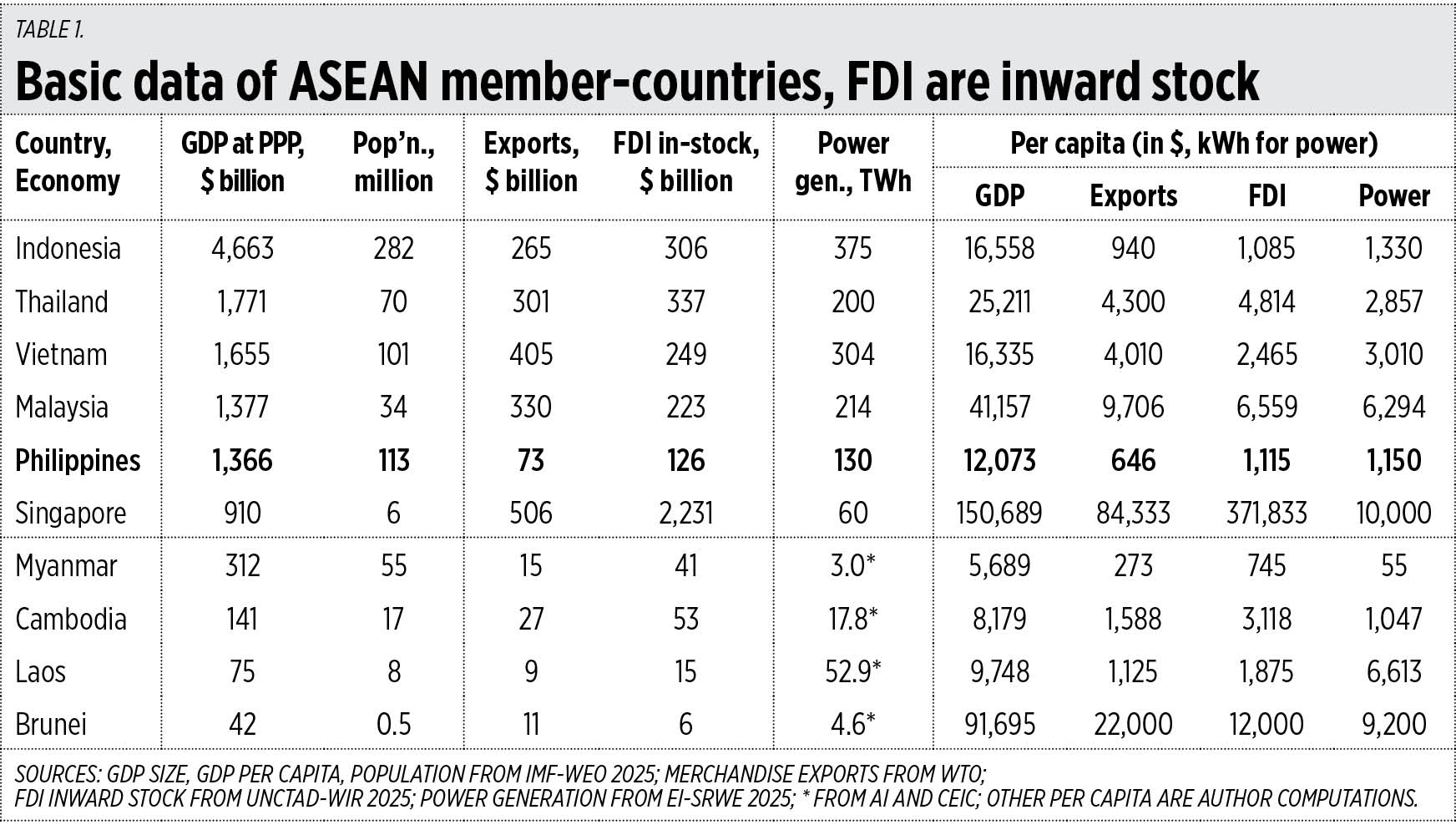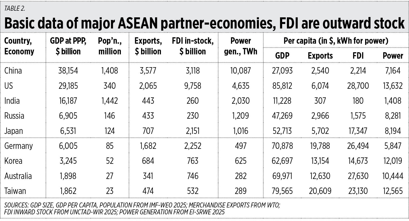 In merchandise trade, the ASEAN had a combined $1.94 trillion in exports in 2024, the third largest in the world after China and the US. In foreign direct investment (FDI) inward stock (inflows minus outflows through the years) the bloc had a combined $3.59 trillion (dominated by Singapore), and was the second largest after the US. And in power or electricity production, it had a combined output of 1,362 terawatt-hours (TWh) in 2024, the fourth largest after China, the US, and India (see Table 1).