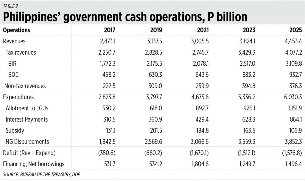 Last Tuesday, the Bureau of the Treasury (BTr) finally released the government’s full year 2025 cash operations report (COR). The fiscal condition remained flattish, the budget deficit was still at around P1.6 trillion a year, financing or net borrowings was still at P1.4 trillion a year. Revenues are rising, but expenditures are rising fast too (see Table 2).