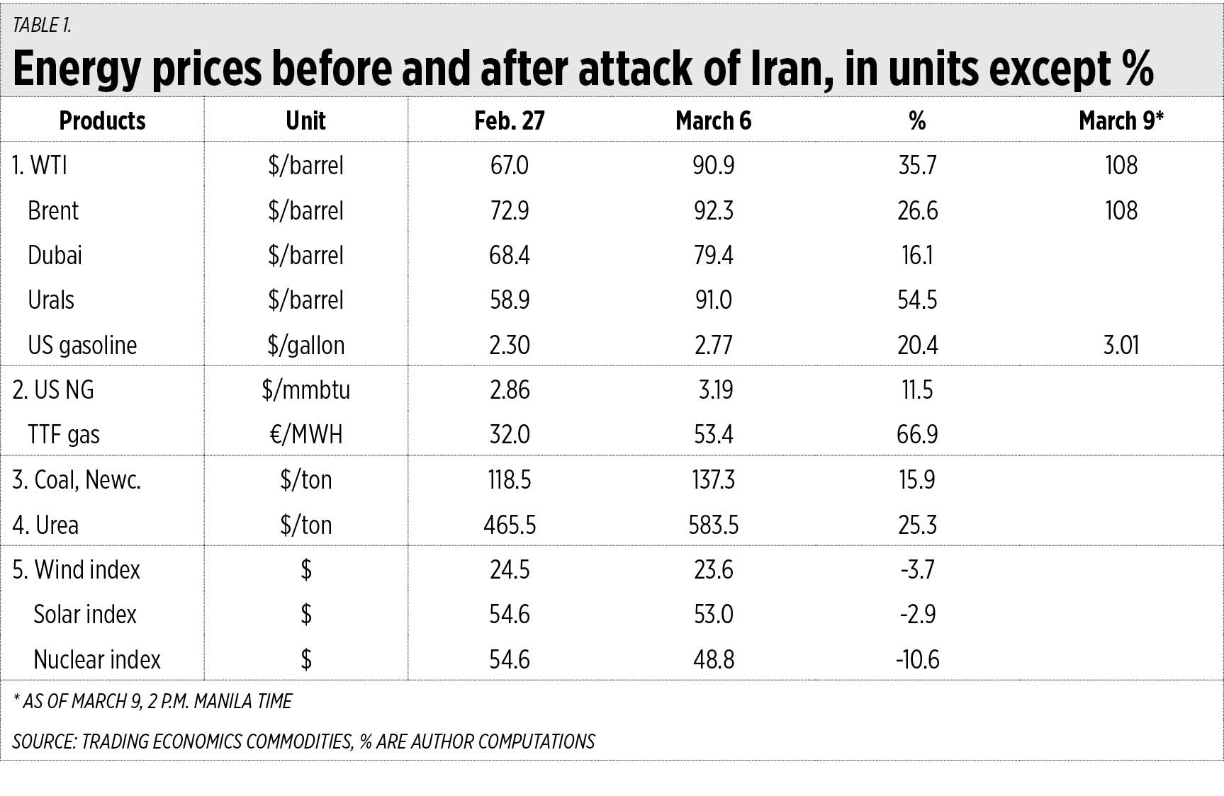 From Feb. 27, or day before the bombing of Iran, to March 6 or after seven days of war, crude oil (WTI, Brent, Dubai, Urals) prices have gone up from 16% to 54%. Natural gas prices have a wider range of increases, with US natural gas increasing by 12% while Europe’s TTF gas increased by 67%.