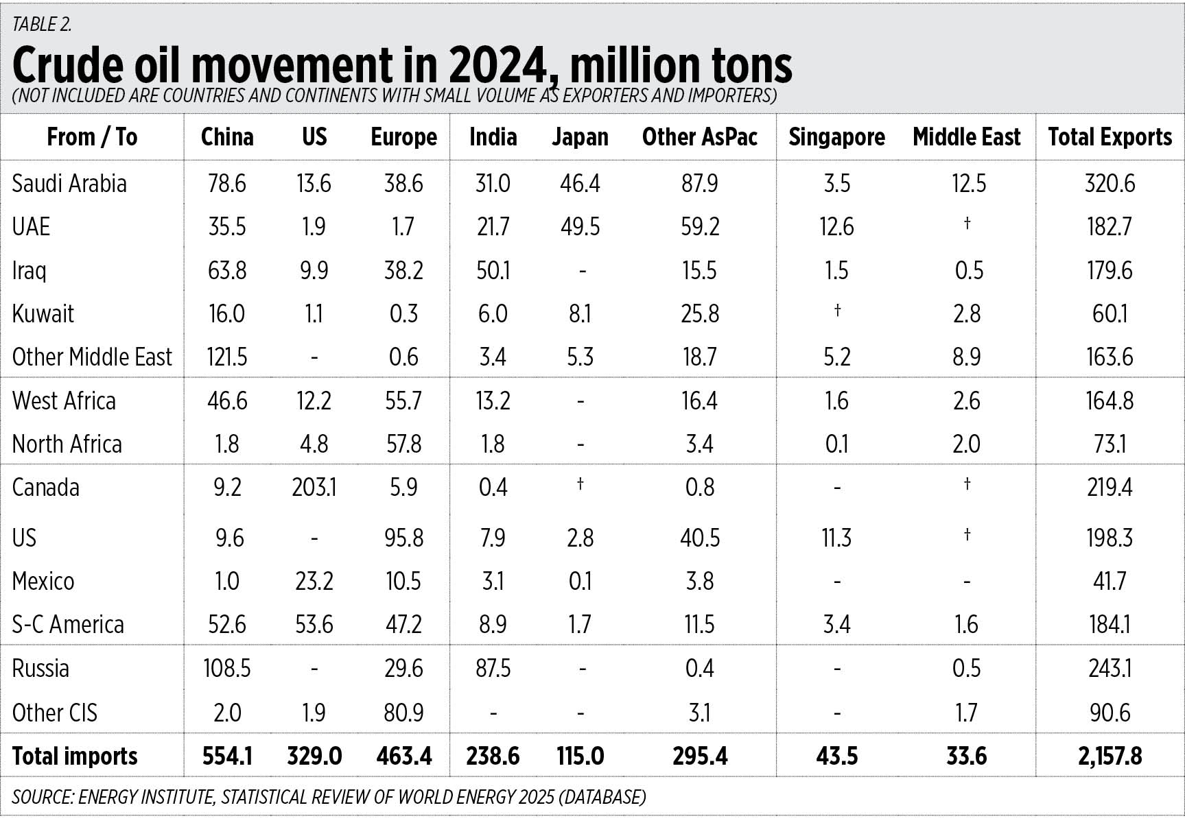 2. The largest importers of crude oil are China, Europe, the US, India, Japan, and other Asia-Pacific nations (Taiwan, Korea, Australia, etc.).