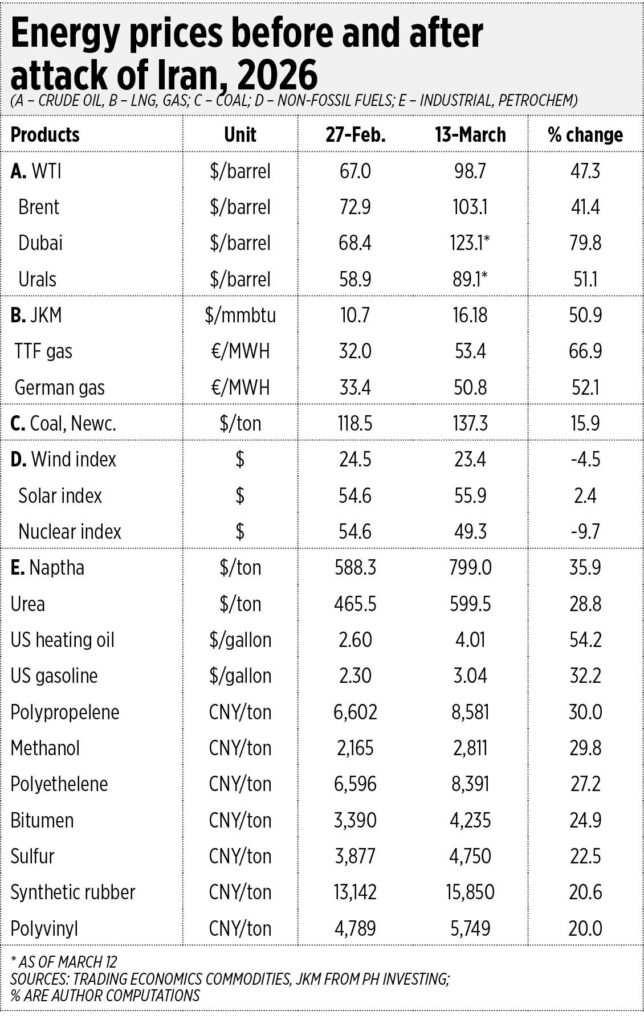 I checked the prices of certain commodities after two weeks of the war. The price of Dubai crude oil is up by 80%, the Japan Korea Market (JKM) LNG price is up by 51%, and TTF gas in Europe is up by 67%. Countries and companies rushed to coal, whose price is now up by 16%, and not to solar and wind power where the price index changed by 2.4% and -4.5% respectively.