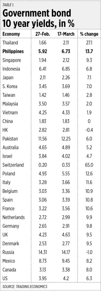 With these moves for either higher spending or cutting taxes, the yields on Philippine 10-year government bonds have spiked, from 5.92% on Feb. 27 (the day before Israel and the US attacked Iran) to 6.73% on March 17 — a 13.7% jump. Thailand has seen a higher expansion of 27% as it plans a huge oil subsidy via its Oil Fuel Fund. In Europe, the largest increase in 10-year bonds was that of Switzerland, from 0.20% to 0.33% yield (see Table 1).