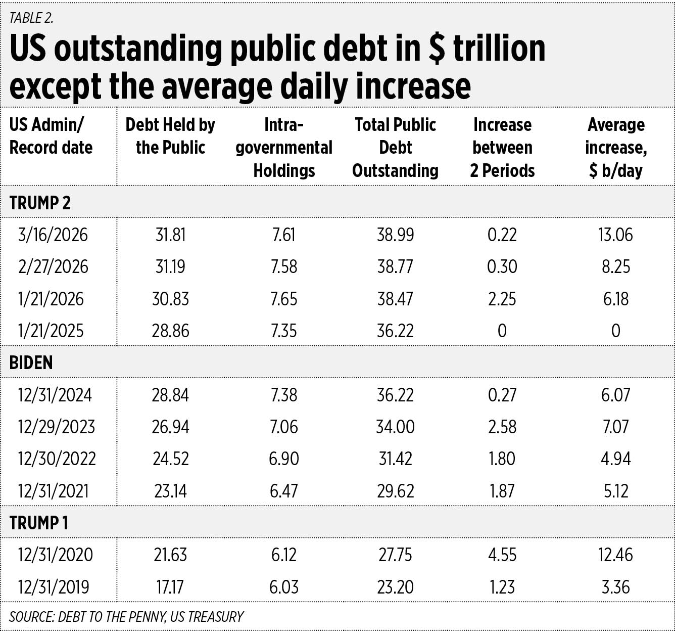 During the four years of the Biden administration, US public debt was rising by $2.12 trillion/year, or an average of $5.8 billion/day. During Trump’s first year, the debt increased by $2.25 trillion or $6.2 billion/day.