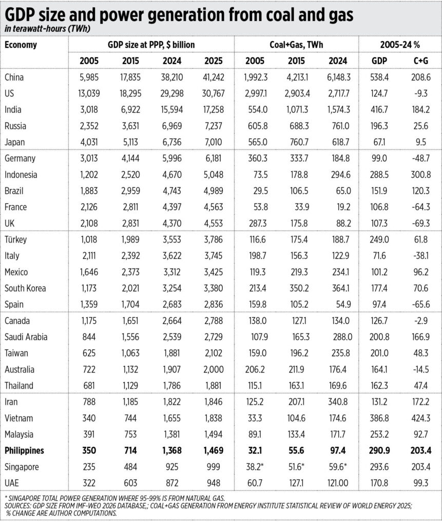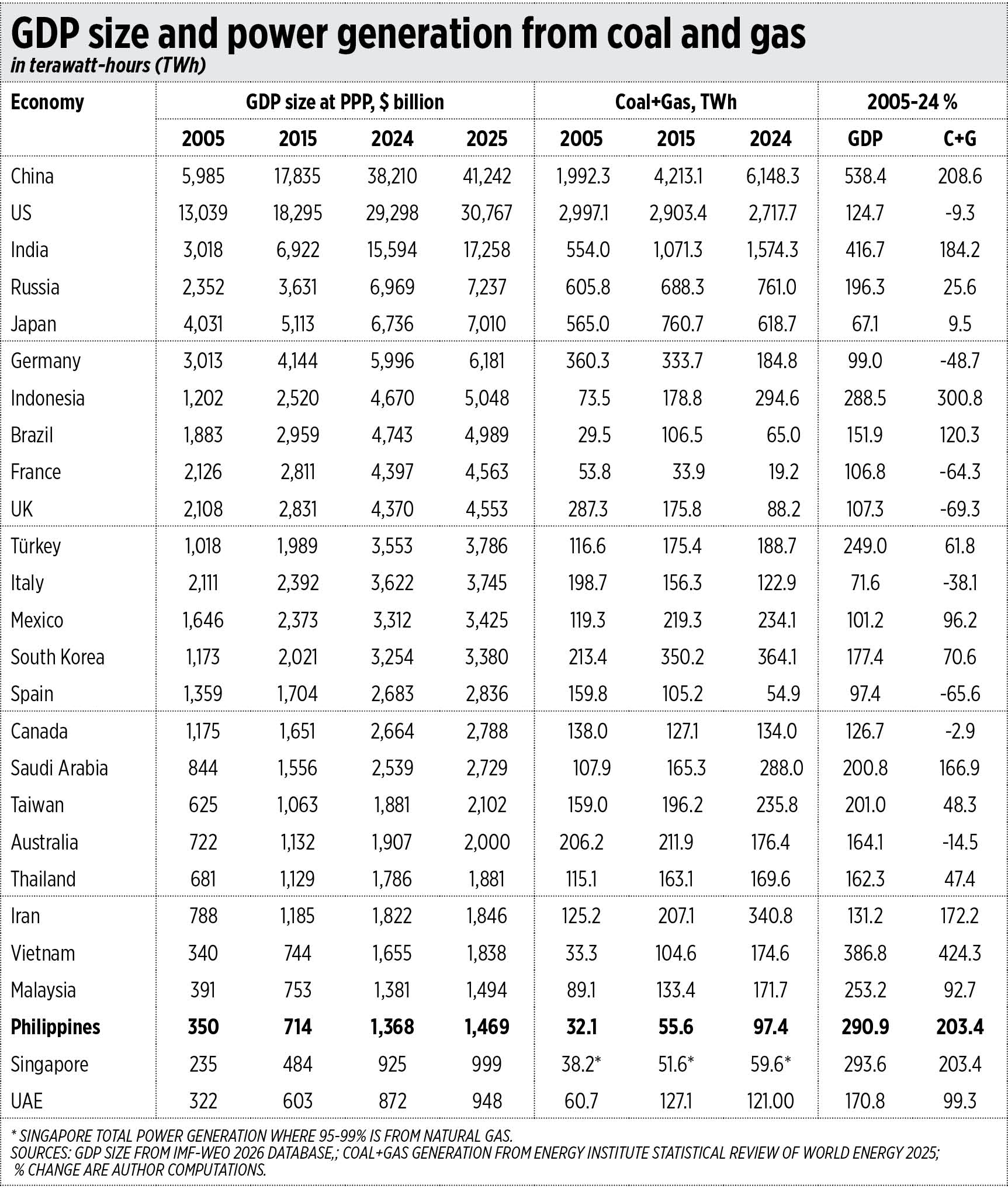 Last week the International Monetary Fund (IMF) released the World Economic Outlook (WEO) 2026, so I downloaded the database Excel files. For this column, I will focus on the GDP size of countries at purchasing power parity (PPP) values. And since there is plenty of noise and lobbying now that we should hasten the transition from fossil fuels (oil, gas, and coal) to renewables (mainly solar and wind power), I compared the power generation from coal and gas of major economies.