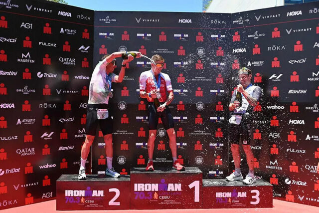 AUSTRALIA’s Josh Ferris (center) reigned supreme in the 2025 IRONMAN 70.3 Lapu-Lapu with Mike Phillips and Sam Osborne completing the podium finish. — IRONMAN.COM