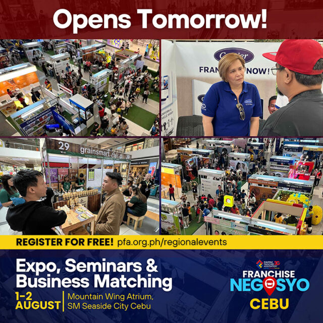 This event is not possible without the help and support of the following partners: Provincial Government of Cebu, City Government of Cebu, DTI Region VII, OWWA Region VII, Cebu City Chamber of Commerce, Mandaue Chamber of Commerce, SM Supermalls, SM Seaside City Cebu, PLDT Enterprise, GCash, Carrier, BPI, Grainsmart Café, UnionBank, Chong’s Chicken Inasal, Jonie’s Sizzlers + Roast, Phoenix LPG, Converge, Villa Tuna, Mayet Dela Rosa Fine Jewelry, K2 Pharmacy, Francorp, U-Franchise, and Qualiplus.