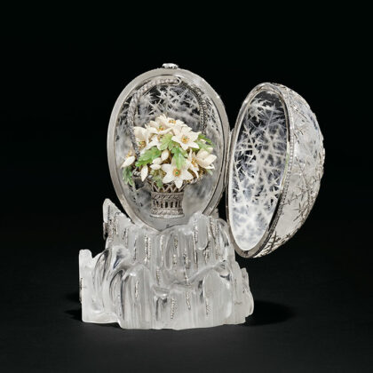 Carved in rock crystal and adorned with rose-cut diamond-set platinum snowflake decorations, the Winter Egg is considered one of Fabergé’s finest creations for the Imperial family, according to Christie’s.