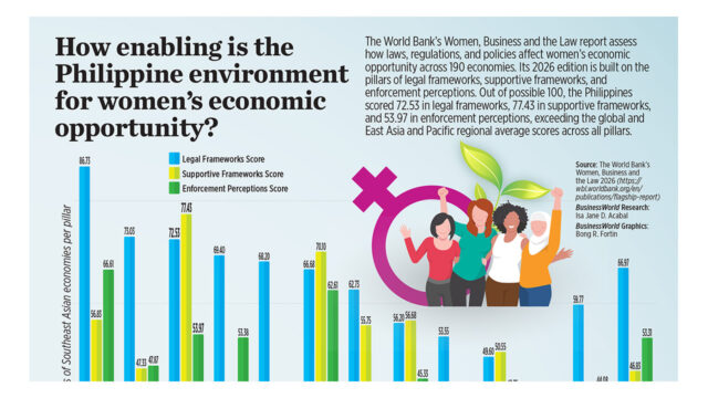 THE PHILIPPINES improved in two of the three pillars in the World Bank’s Women, Business, and the Law (WBL) 2026 report, with scores surpassing the global and East Asia and Pacific averages.