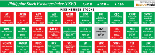 Week on week, the PSEi climbed by 80.54 points from its Feb. 13 finish of 6,384.58.