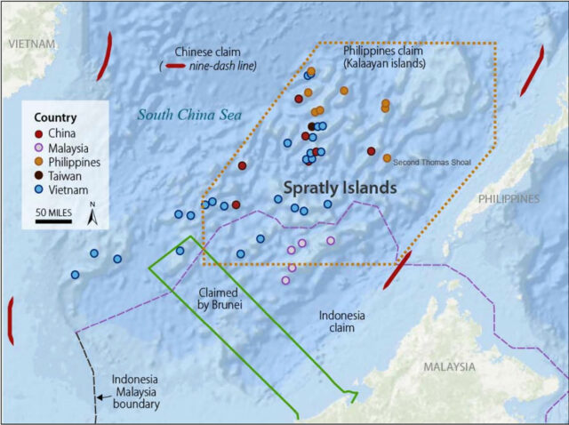 China’s insistence on its own “nine-dash line” as its demarcation of its territorial and sovereign rights in the South China Sea has caused conflicts of interest with and among its neighbors. Its self-serving boundaries cover most of the South China Sea (SCS), overlapping with the exclusive economic zone (EEZ) claims of Brunei, Indonesia, Malaysia, the Philippines, Taiwan, and Vietnam.