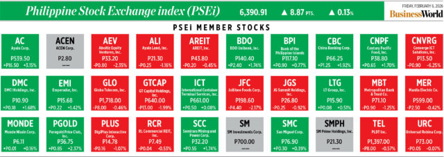 On Friday, the bellwether Philippine Stock Exchange index (PSEi) inched up by 0.13% or 8.87 points to end at 6,390.91, while the broader all shares index went down by 0.09% or 3.40 points to close at 3,584.43.