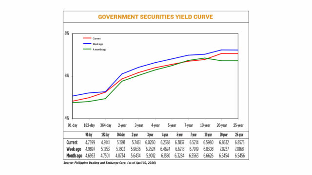 GS yields, which move opposite to prices, fell by 19.92 basis points (bps) on average week on week, based on PHP Bloomberg Valuation Service Reference Rates data as of April 10 published on the Philippine Dealing System’s website.