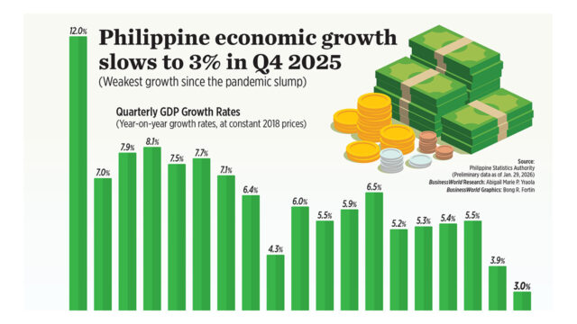 The Philippine economy grew 3% in the fourth quarter, the slowest in almost five years and bringing full-year growth to 4.4%. This was way below the state’s 5.5-6.5% target for the year.
