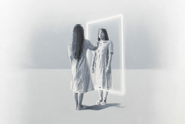 His work (Con)sumed shows three figures sucking the soul out of a woman’s body, a haunting scene that can be interpreted as three versions of a person eating her whole. In m(e)irrored, the struggle of identity amid the effects of technology is more evident, as a woman faces an image of herself on a screen, both of their visages blurred.
