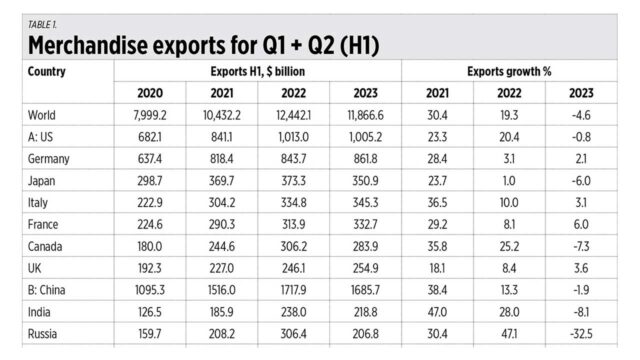 In Table 1, I compare exports performance in Q1 + Q2 or the first half (H1) of 2020 to 2023. Global exports contracted by 4.6% in H1 2023 compared to H1 2022. I grouped the countries into three: Group A is made up of G7 industrial countries, Group B is the BRICS nations, and Group C contains major and medium East Asian exporters. European exports have expanded among each other, but all East Asian exporting countries plus India suffered contractions this year.