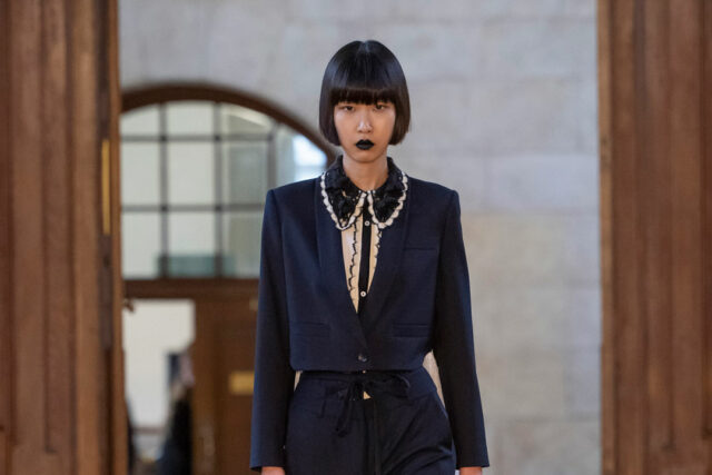 London-based Turkish designer Bora Aksu opted for a mainly black and white line, inspired by Norwegian painter Edvard Munch and fictional character Wednesday Addams and which celebrated outcasts.
