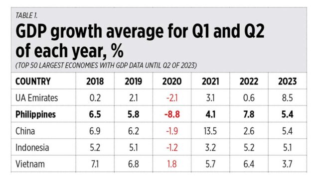 I checked the GDP performance of the world’s top 50 largest economies in GDP size nominal values in 2022 (No. 1 was the USA, No. 2 China, No. 39 the Philippines, No. 50 Portugal). Of these 50 economies, five have no quarterly data, and as of this writing, 22 have GDP data until Q1 only (including Japan, Thailand, India, Malaysia, and Canada), and 23 have data until Q2. I averaged the Q1 and Q2 or first half (H1) performance of the 23 economies that provided the data, and the results are very interesting. (See Table 1)