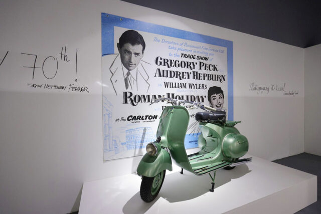That was when she started acting, taking roles on stage, and then small parts in movies. While shooting another small role in the film Monte Carlo Baby, Ms. Hepburn was discovered by French novelist Collette, who cast her as the lead for her play Gigi. That would lead to her being noticed by Paramount Pictures which chose her to play a princess who spends a madcap day in Rome with a reporter but would have to give up love for duty and return to her royal job in the film Roman Holiday. For that role, she would win her first Oscar at 23. The Vespa scooter from the film can be seen in the exhibit.