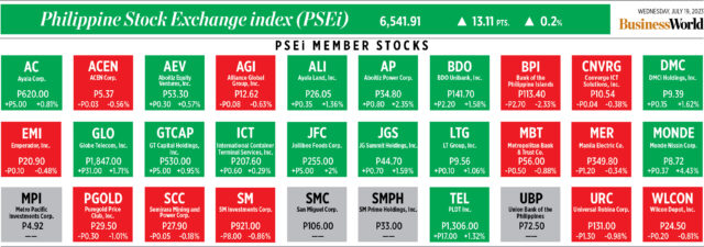 The Philippine Stock Exchange index (PSEi) rose by 13.11 points or 0.2% to 6,541.91 on Wednesday, while the broader all shares index went up by 8.16 points or 0.23% to 3,490.91.