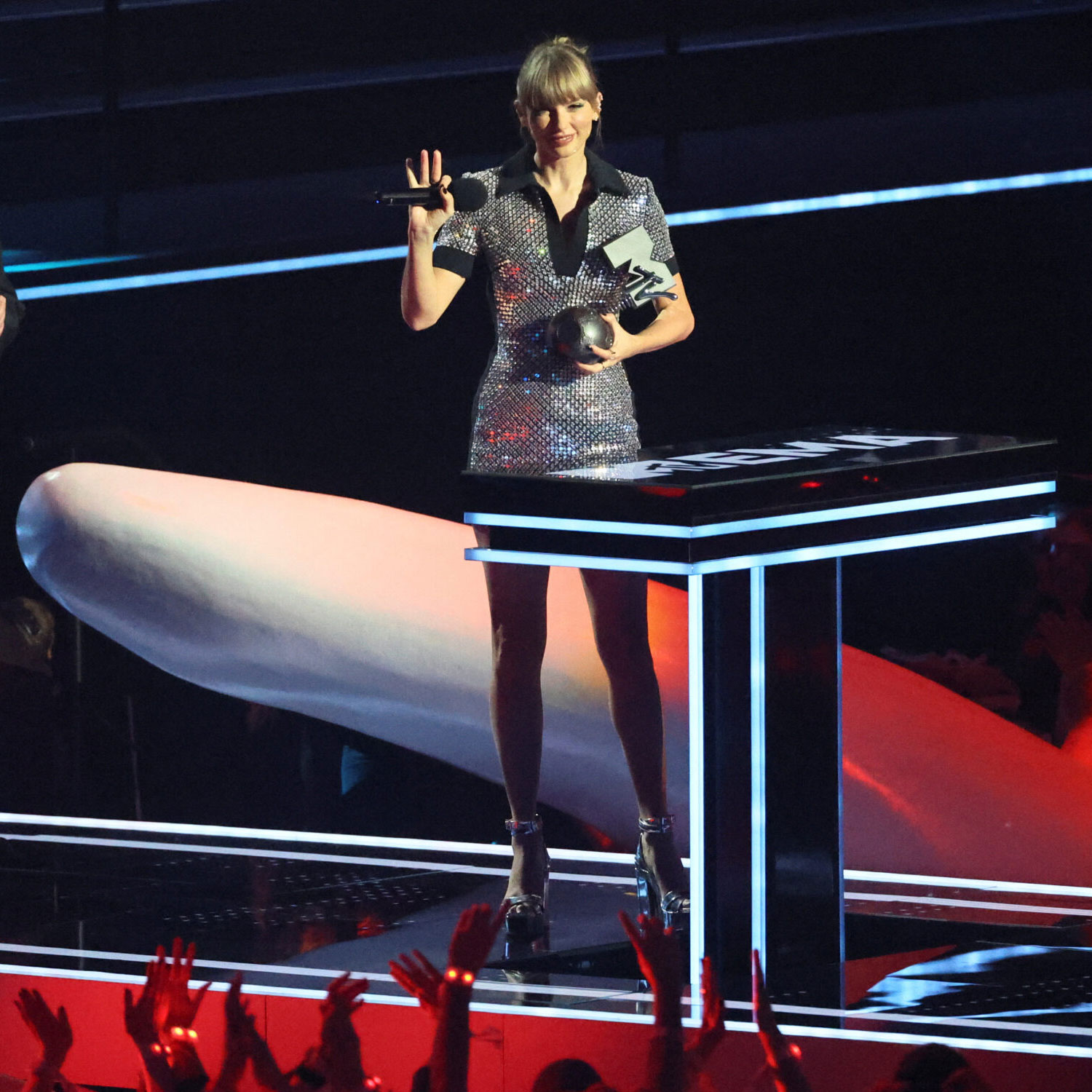 The US pop singer Ms. Swift, wearing a dress of bejeweled mesh, won best artist, best pop song, best video, and best long-form video.