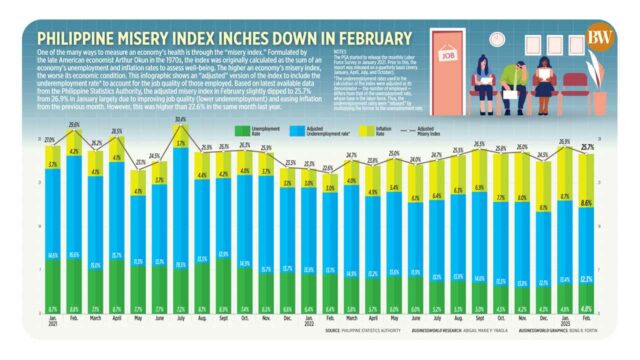 One of the many ways to measure an economy’s health is through the “misery index.” Formulated by the late American economist Arthur Okun in the 1970s, the index was originally calculated as the sum of an economy’s unemployment and inflation rates to assess well-being. The higher an economy’s misery index, the worse its economic condition. This infographic shows an “adjusted” version of the index to include the underemployment rate* to account for the job quality of those employed. Based on latest available data from the Philippine Statistics Authority, the adjusted misery index in February slightly dipped to 25.7% from 26.9% in January largely due to improving job quality (lower underemployment) and easing inflation from the previous month. However, this was higher than 22.6% in the same month last year.