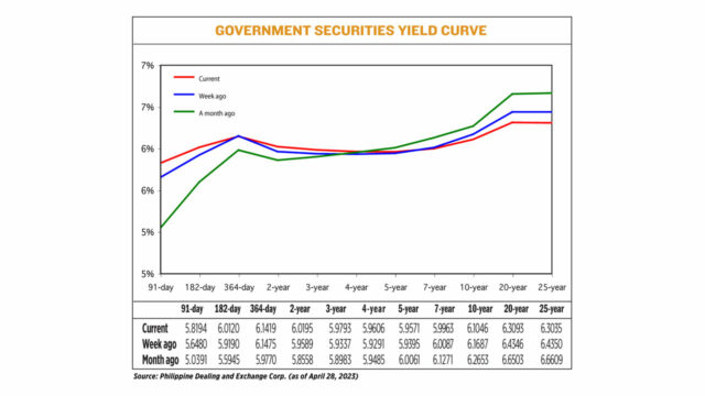 GS yields, which move opposite to prices, went up by an average of 0.73 basis point (bp) week on week, based on the PHP Bloomberg Valuation Service Reference Rates as of April 28 published on the Philippine Dealing System’s website.