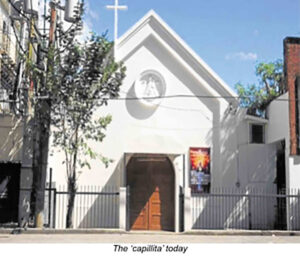 To get to the capillita, traveling north on Ayala Bridge, turn left at its foot which is Carlos Palanca St. (formerly Calle del Rosario, then Echague). The white concrete chapel is 200 meters away on the right-hand side.