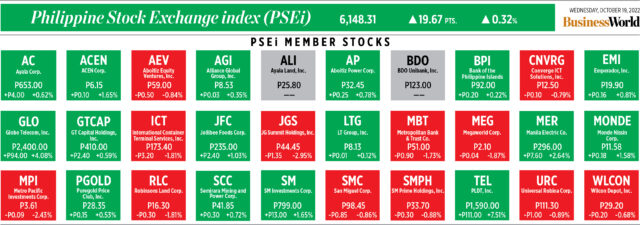The bellwether Philippine Stock Exchange index (PSEi) rose by 19.67 points or 0.32% to close at 6,148.31 on Wednesday, while the broader all shares index went up by 13.11 points or 0.4% to 3,266.62.