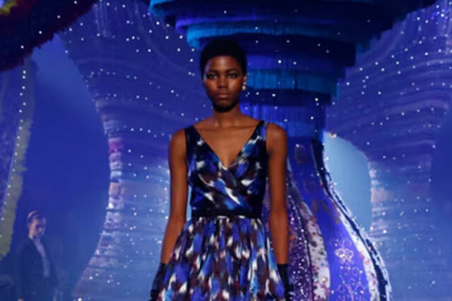 The set, which included low-hanging bronze chandeliers, evoked the ballroom of the Intercontinental Hotel, the label’s favored venue for haute couture collections in the late 1970s through the start of the 2000 — but transported into a “radically contemporary black-box setting,” according to the label’s show notes.