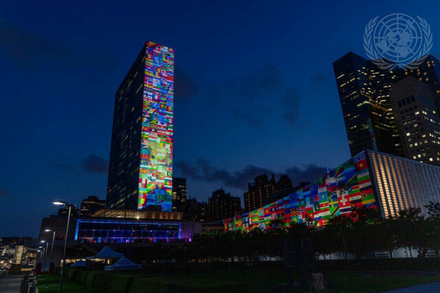 A LANDMARK LAUNCH of Scoring for the Goals event with projection of images of Sustainable Development Goals on the UN Building in New York City, Sept. 17, 2022. — UN PHOTO/CIA PAK