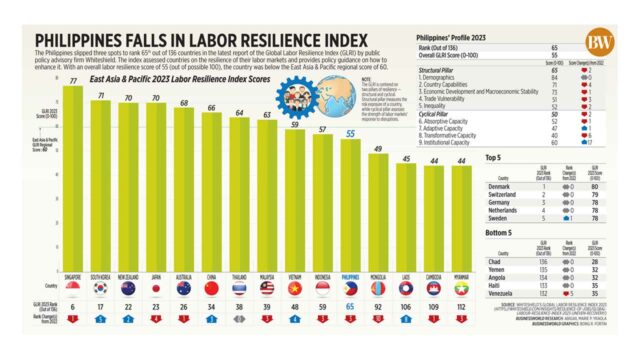The Philippines slipped three spots to rank 65th out of 136 countries in the latest report of the Global Labor Resilience Index (GLRI) by public policy advisory firm Whiteshield. The index assessed countries on the resilience of their labor markets and provides policy guidance on how to enhance it. With an overall labor resilience score of 55 (out of possible 100), the country was below the East Asia & Pacific regional score of 60.
