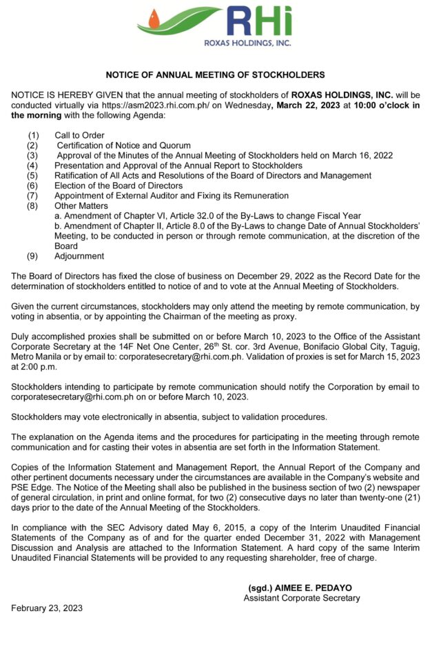 Roxas Holdings, Inc. to hold annual meeting of stockholders on March 22