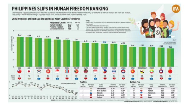The Philippines slipped by a notch to 103rd out of 165 countries in the latest edition of the Human Freedom Index (HFI), co-published by the Cato Institute and the Fraser Institute. The country’s overall HFI score fell by 0.17 point to 6.52 in 2020. It was also below the 6.81 global average score.