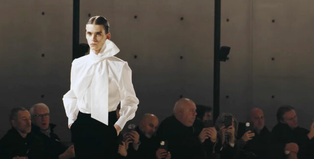 The Kering-owned label took to the circular Bourse de Commerce — a historic wheat exchange refurbished to house the Pinault Collection of contemporary art —sending models around the space in dark trench coats with prominent shoulders and white blouses, dressed up with oversize bows, or cut low, showing skin.